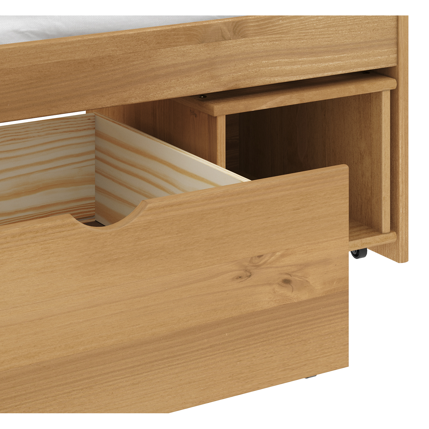 Hledáte ideální postel pro malé dítě, dospívajícího školáka nebo studenta vysoké školy?Jednolůžko se zásuvkami 8809V je tím pravým kouskem nábytku, který bude růst s vašimi dětmi a vyřeší i spoustu úložných prostorů. Kvalitní jednolůžko v provedení masiv borovice voskovaná v medovém odstínu zajisté zaujme malé i velké, a to nejen díky svému pohodlí. Široká zásuvka spolu s nikou a čtyřmi malými zásuvkami pojmou vše, co potřebujete uschovat, ale současně mít po ruce. Do širší zásuvky vložíte ložní prádlo či větší hračky a do menších zásuvek pak polštáře, nejrůznější drobnosti a menší hračky, v nice může být uschována například aktovka nebo školní taška. Jednolůžko se zásuvkami 8809V potěší také obyvatele garsonek či malých bytů, tento nápaditý kousek nábytku totiž jednoduše proměníte v pohodlnou sedačku, a to pouze přidáním čalouněného válce nebo většího množství polštářků.