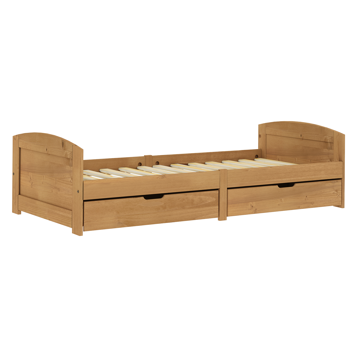 Jednolůžko MARIA z masivu borovice s voskovaným povrchem přináší čistý design, praktickou funkčnost a hřejivý přírodní vzhled do každé ložnice nebo dětského pokoje. Svým jednoduchým stylem nepůsobí zbytečně, přesto si vás získá kvalitou a promyšleností. Voskovaná úprava zvýrazňuje jemné struktury dřeva a dává posteli autentický vzhled bez nutnosti použití složitých efektů. Tento povrch zároveň chrání materiál a usnadňuje údržbu, takže bude nábytek i po letech vypadat stále pěkně. Konstrukce z masivu vyzařuje stabilitu, pevnost a dlouhodobou životnost. Praktický prvek v podobě dvou pojízdných zásuvek na kolečkách, které jsou součástí balení, nabídne cenný odkládací prostor. Snadno se vysunují, což oceníte při každodenním využívání a navíc vám uspoří místo, protože nepotřebujete další komodu nebo truhlu. Součástí postele je také kvalitní laťkový rošt, díky němuž máte už od základu zajištěnou pevnou oporu matrace. Díky tomu se postel velmi dobře přizpůsobí individuálním potřebám spaní, přitom matraci si můžete vybrat podle sebe. Matrace není součástí balení, což dává volnost při jejím výběru. Postel MARIA je poctivý kus nábytku, který vypadá nenápadně, ale když ji jednou využijete, hned si všimnete, jak je promyšlená. Kombinuje praktičnost, přírodní vzhled a trvanlivost bez zbytečné přehršle dekorací. Je to kus, co dává smysl a dokáže zpříjemnit každodenní odpočinek i usnadnit udržování pořádku.
