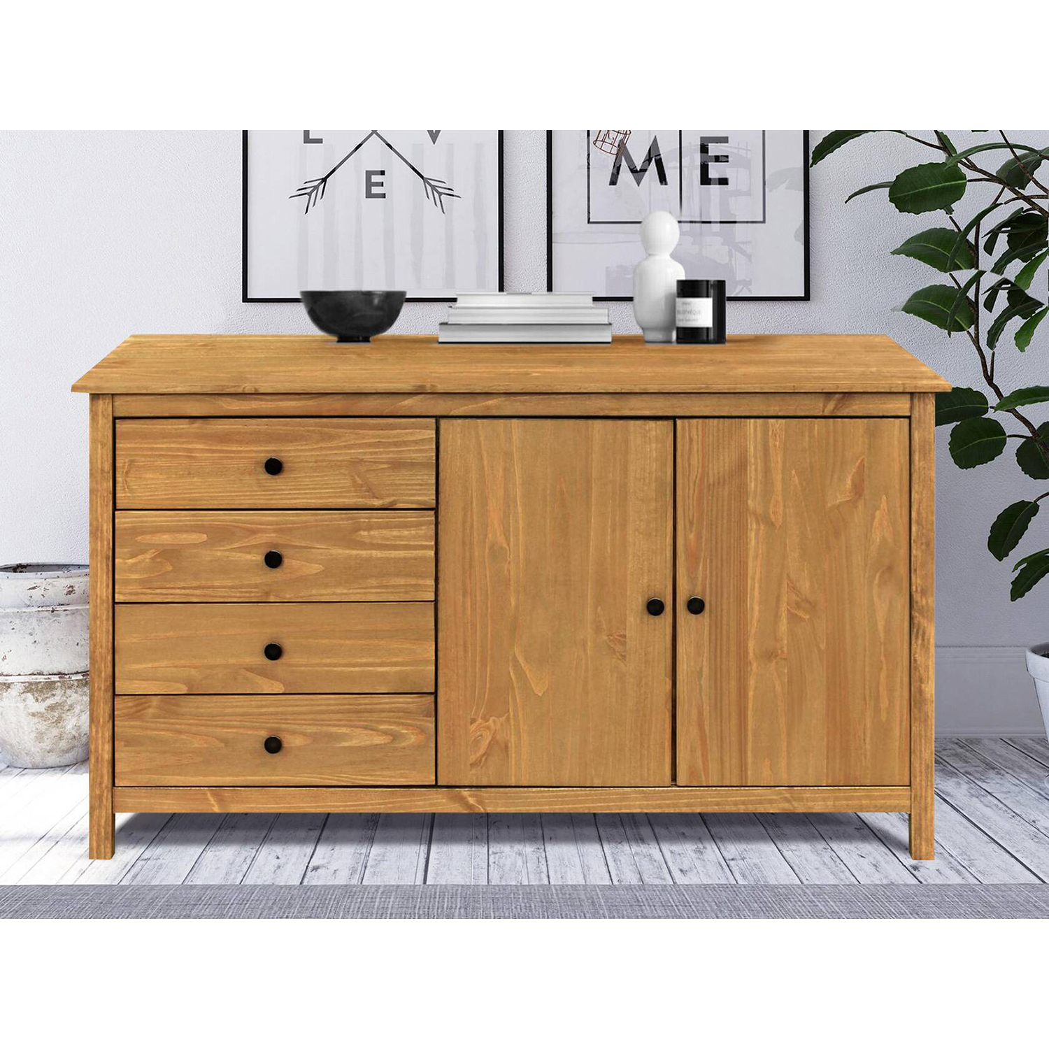 Код продукта: 8061Vmateriál masiv borovice voskovaná v medovém odstínu kovové úchytky v barevném provedení černěná mosaz 3 zásuvky s kovovými pojezdy, 3 plné dveře, 2 police maximální nosnosti uvedeny v návodu k montáži