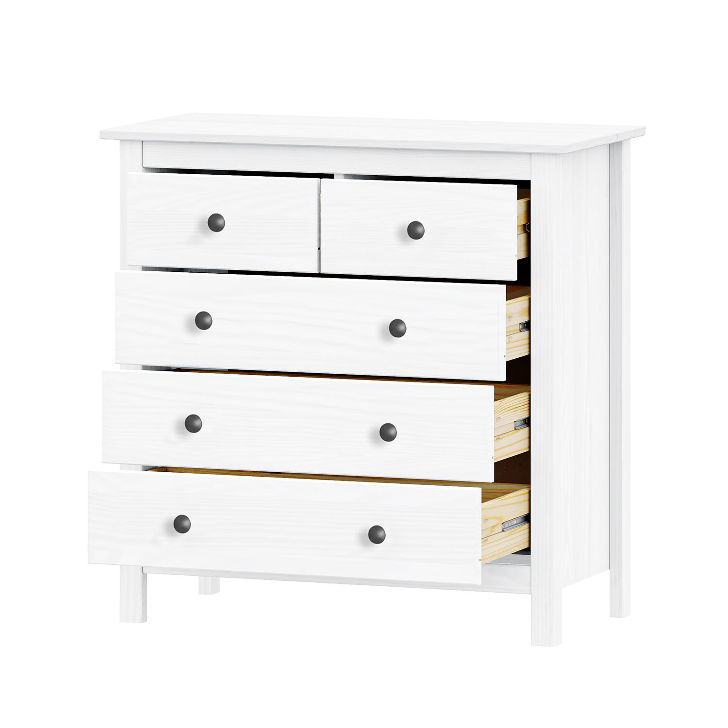 Комод изготовлен из массива сосны и покрыт белым лаком, что придает ему свежий и элегантный вид. Этот предмет мебели сочетает в себе стиль и практичность, что делает его идеальным дополнением к любому интерьеру. Комод оснащен металлическими ручками, которые не только придают ему эстетическую ценность, но и обеспечивают легкое открывание и закрывание ящиков. Всего в комоде пять ящиков - два маленьких и три больших - с металлическими полозьями, обеспечивающими плавный и бесшумный ход. Маленькие ящики идеально подходят для хранения мелких предметов, таких как украшения, документы или другие небольшие вещи. В больших ящиках достаточно места для одежды, постельного белья и других крупных предметов. Сочетание качественного материала, практичного пространства для хранения и элегантного дизайна делает этот комод не только функциональным, но и стильным дополнением к вашему дому.