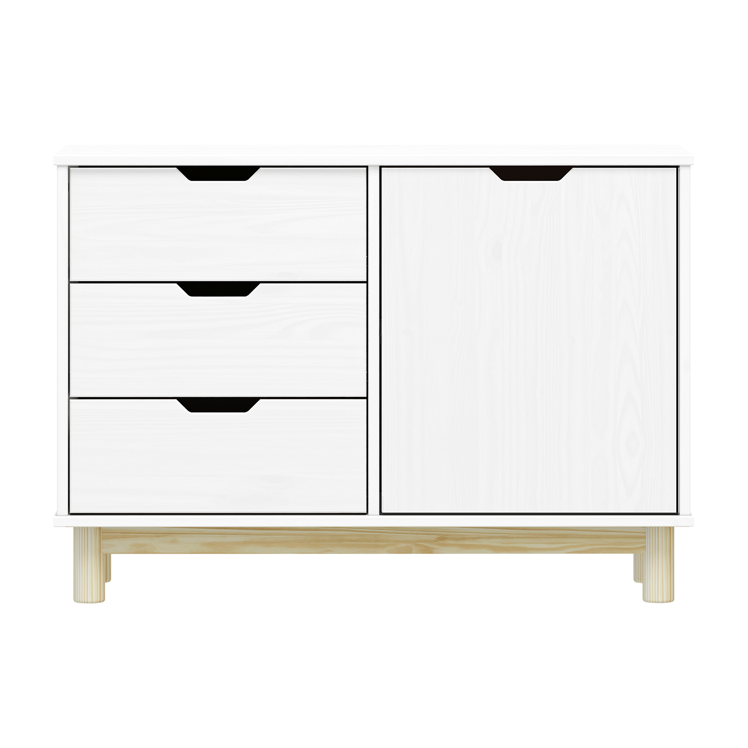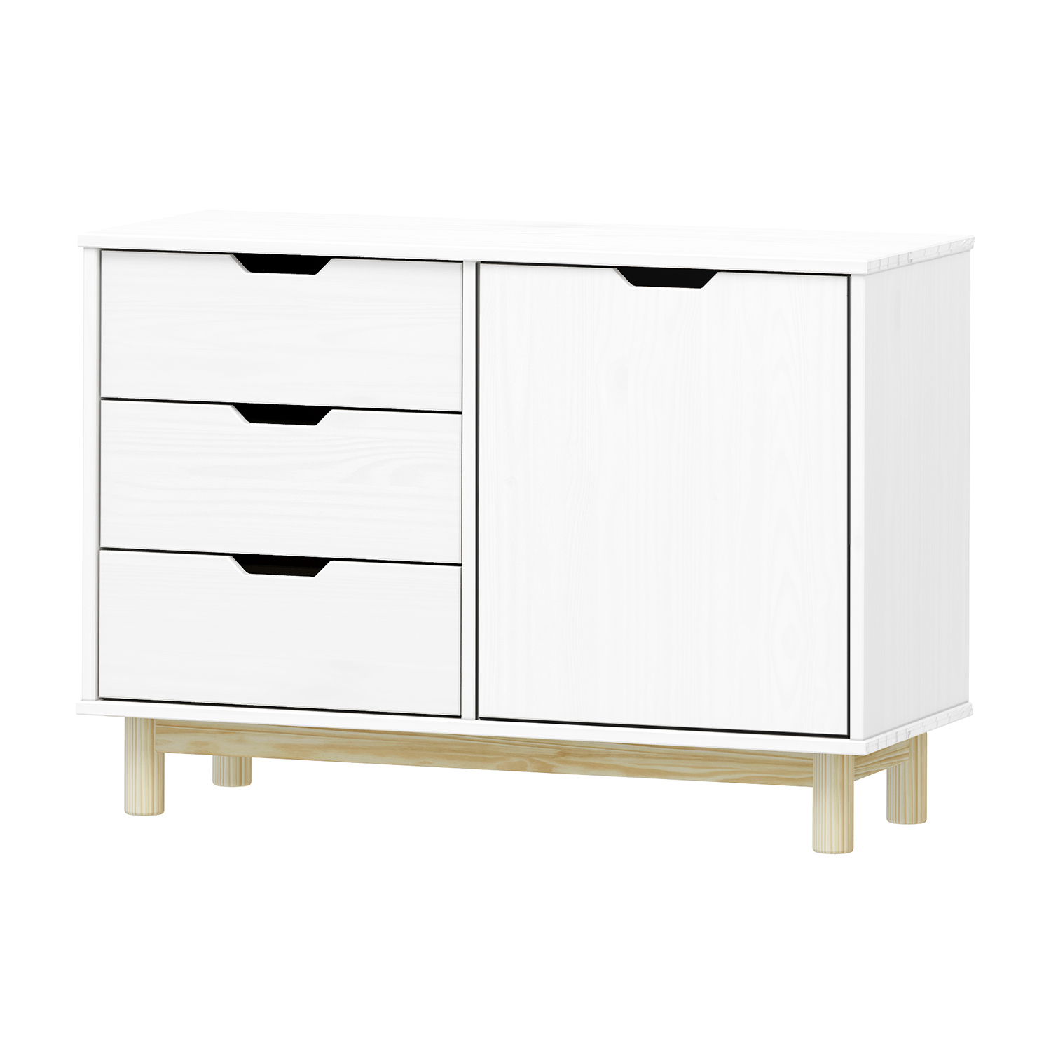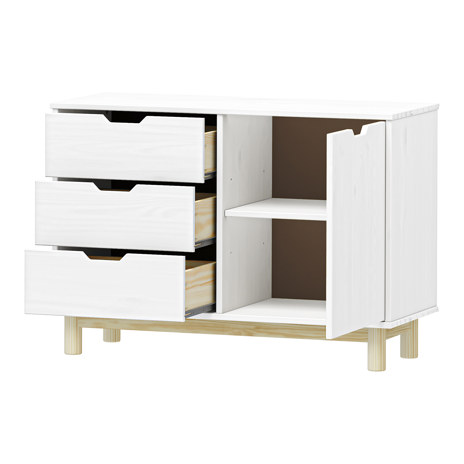 Код продукта: 32431materiál masiv borovice, barevné provedení bílý lak 3 zásuvky s kovovými pojezdy, 2 dvířka, 1 police