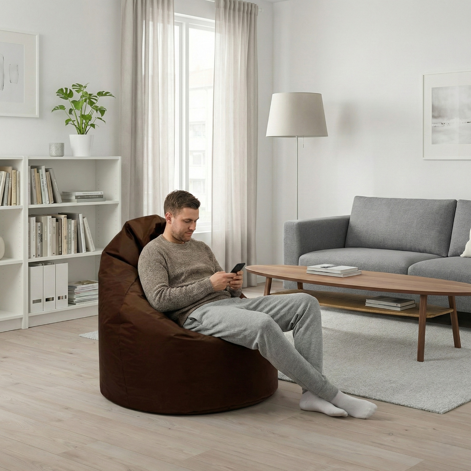 грушевидная сумка-сиденье нейлоновый чехол, цвет коричневый наполнен полистироловыми шариками, объем наполнения 400 л застежка-молния, наполнение можно пополнять или снимать цена с наполнителем