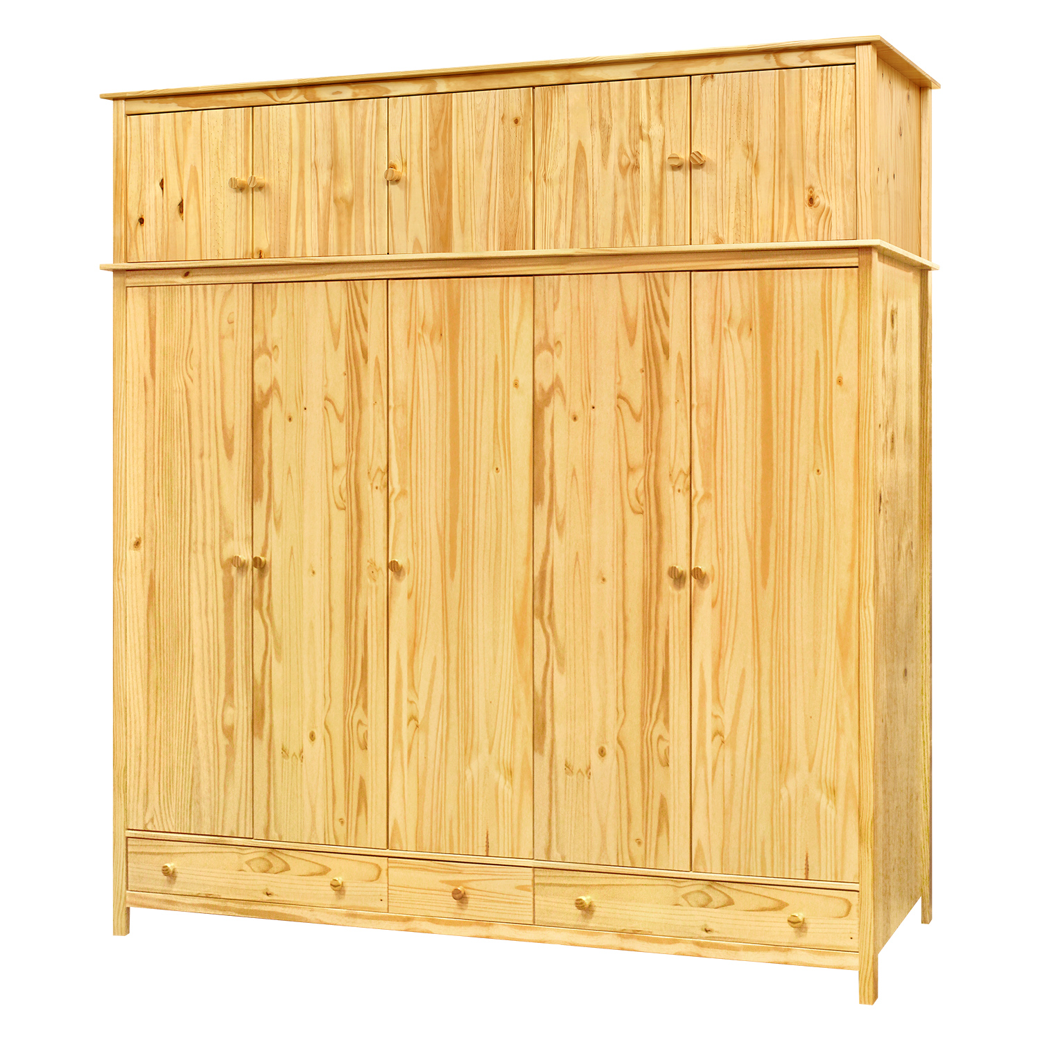 Если у вас большая семья или вы просто любите моду и у вас много одежды, то пятидверный шкаф TORINO придется вам по вкусу. Он изготовлен из массива сосны и имеет лакированную отделку. Пространство в шкафу выполнено в соотношении 2:1:2. В левой и правой широкой части находится вместительная гардеробная штанга и полки для сезонной одежды или головных уборов. На штангу можно повесить платья, пальто, куртки или рубашки. В средней узкой части расположены 3 полки для хранения футболок и свитеров. В нижней части находятся 3 выдвижных ящика с металлическими полозьями, в которых можно хранить нижнее белье. Поскольку шкаф действительно очень вместительный, в нем обязательно найдется место для постельного белья. Он будет отлично смотреться не только в коттедже или на даче, но и в современном доме.