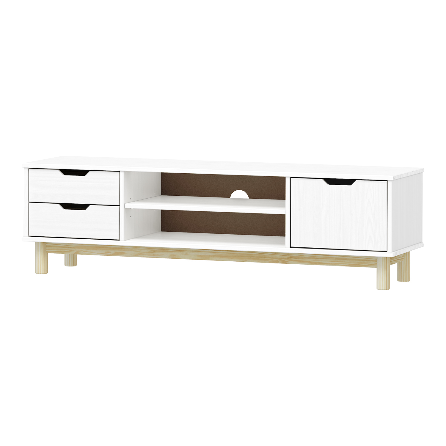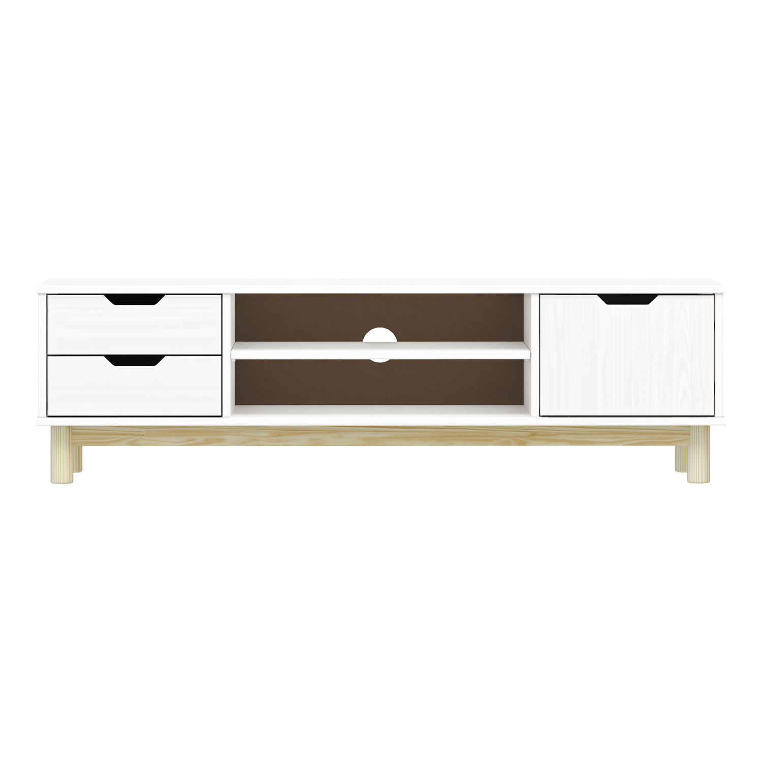 materiál masiv borovice, lakované provedení 2 zásuvky s kovovými pojezdy, 1 dvířka, 1 police otvor na protažení kabelů