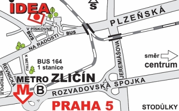 Směr Praha - Plzeň po Plzeňské ulici, dále po ulici Na Radosti - odbočka z ulice Na Radosti 1km od křižovatky Jeremiášova - Plzeňská.